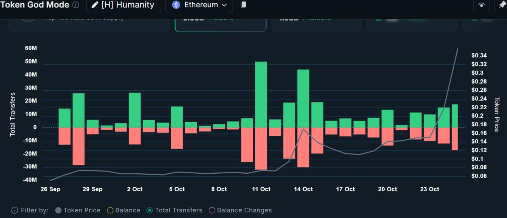 來自Nansen的數據表明,自10月22日以來,“鯨魚”的地位不斷增加。在過去的24小時內,該組淨購買了390萬枚代幣,使累計購買總量達到5400萬枚代幣——這是一個明確的信號,表明大量資金正強勁流入Humanity。