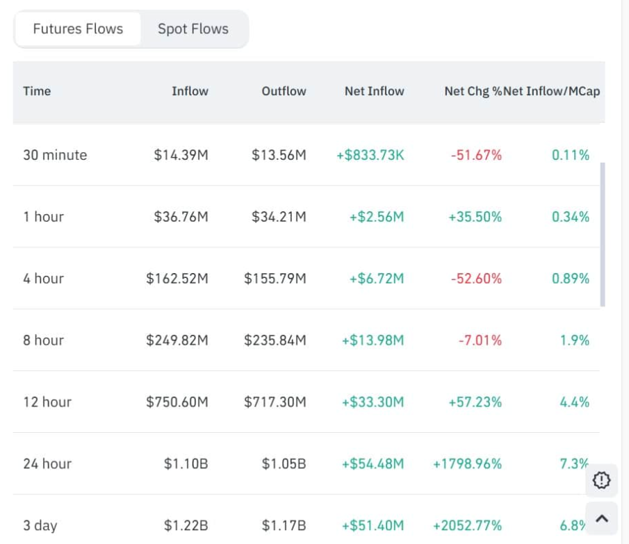 值得注意的是,流入期貨市場的資金在連續三天內保持在高位,達到12.2億美元。僅在Humantiy方面,期貨資金流入達到11億美元,而流出資金僅爲10.5億美元——這使得淨流入資金激增1798%,達到5448萬美元,反映出投資者日益強烈的吸引力。
