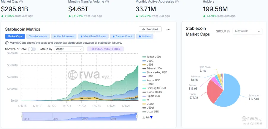 穩定幣總市值達2,956.10億美元,環比上月同期增長1.85%,實現溫和增長;月度轉帳量飆升至4.65萬億美元,環比上月同期大漲41.76%;月活地址總數回升至3,371.00萬,環比上月同期上漲22.78%;持有者總數約2.00億,環比上月同期微增3.70%,兩者共同確認市場進入「效率驅動」的健康擴張週期,存量資金週轉效率與用戶活躍度同步提升,形成良性共振。數據表明,機構結算需求與零售交易回流形成合力,轉帳量爆發式增長遠超市值增速,凸顯鏈上支付結算功能強化。頭部穩定幣為USDT、USDC及USDe,其中USDT市值環比上月同期上漲3.82%;USDC市值環比上月同期微增1.84%;USDe市值降幅進一步惡化,環比上月同期大幅下滑31.21%。