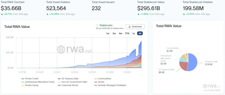 RWA.xyz 最新數據披露,截至2025年10月31日,RWA 鏈上總市值達356.60億美元,環比上月同期提高8.77%,增速有所放緩;資產持有者總數突破52.36萬,環比上月同期上漲10.39%,顯示市場參與度持續提升;資產發行方總數升至232家。