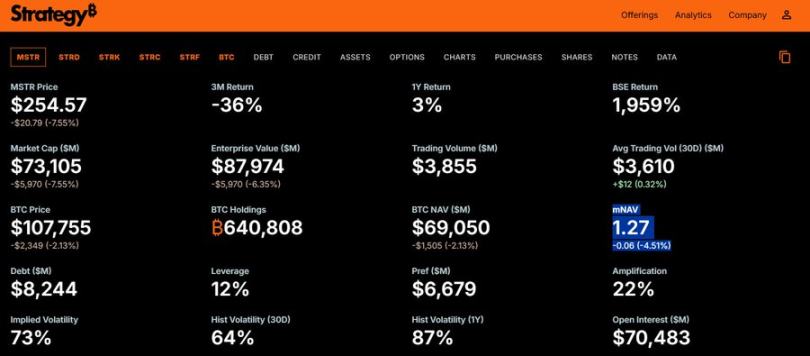 Bitcoin NAV:公司持有的比特幣市值(當前約 64 萬枚 BTC,價值超 700 億美元)。
