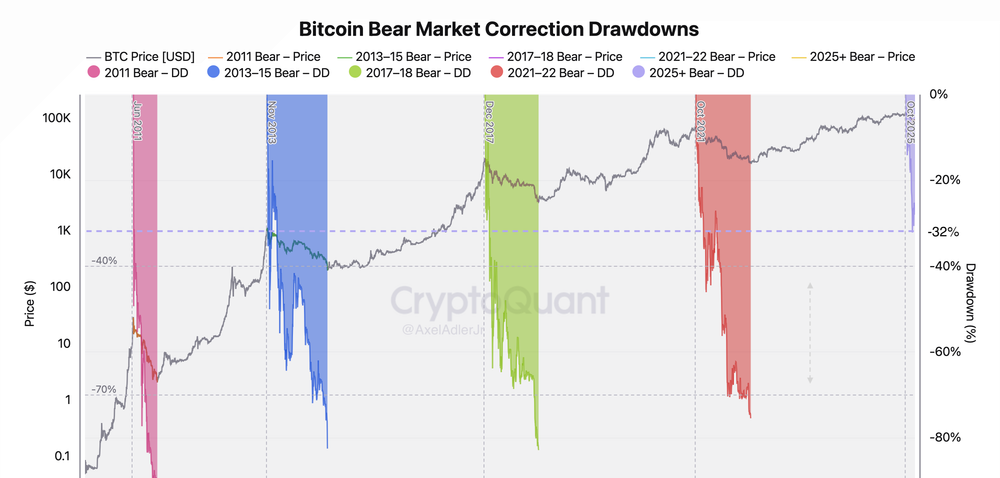 隨著年底臨近,關鍵問題是這次修正是否會穩定在歷史高點後的-35%至-40%之間,顯示出一個更「平坦」的新週期,還是市場會遵循歷史趨勢,通常會深度下跌60%至-70%。