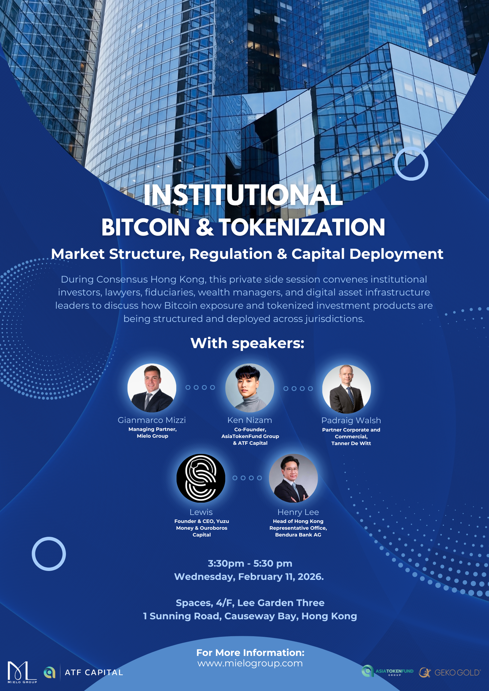 專家小組將共同探討機構比特幣配置、代幣化投資結構、監管考量以及在不斷演變的法律框架下的負責任資金部署。**該會議將於2026年2月11日星期三下午3:30至5:30在香港銅鑼灣利園三期4樓Spaces舉行。📅 日期:2026年2月11日,星期三⏰ 時間:下午3:30 – 5:30📍 地點:香港銅鑼灣利園三期4樓Spaces🔒 形式:閉門高層討論🤝 預期內容:一場專為高階參與者設計的獨家會議,讓他們能直接與同行及數字資產採用前沿的專家進行坦率對話、分享見解並建立有意義的聯繫。欲了解更多資訊,請訪問 www.mielogroup.com 報名請訪問 https://luma.com/65lbecaq