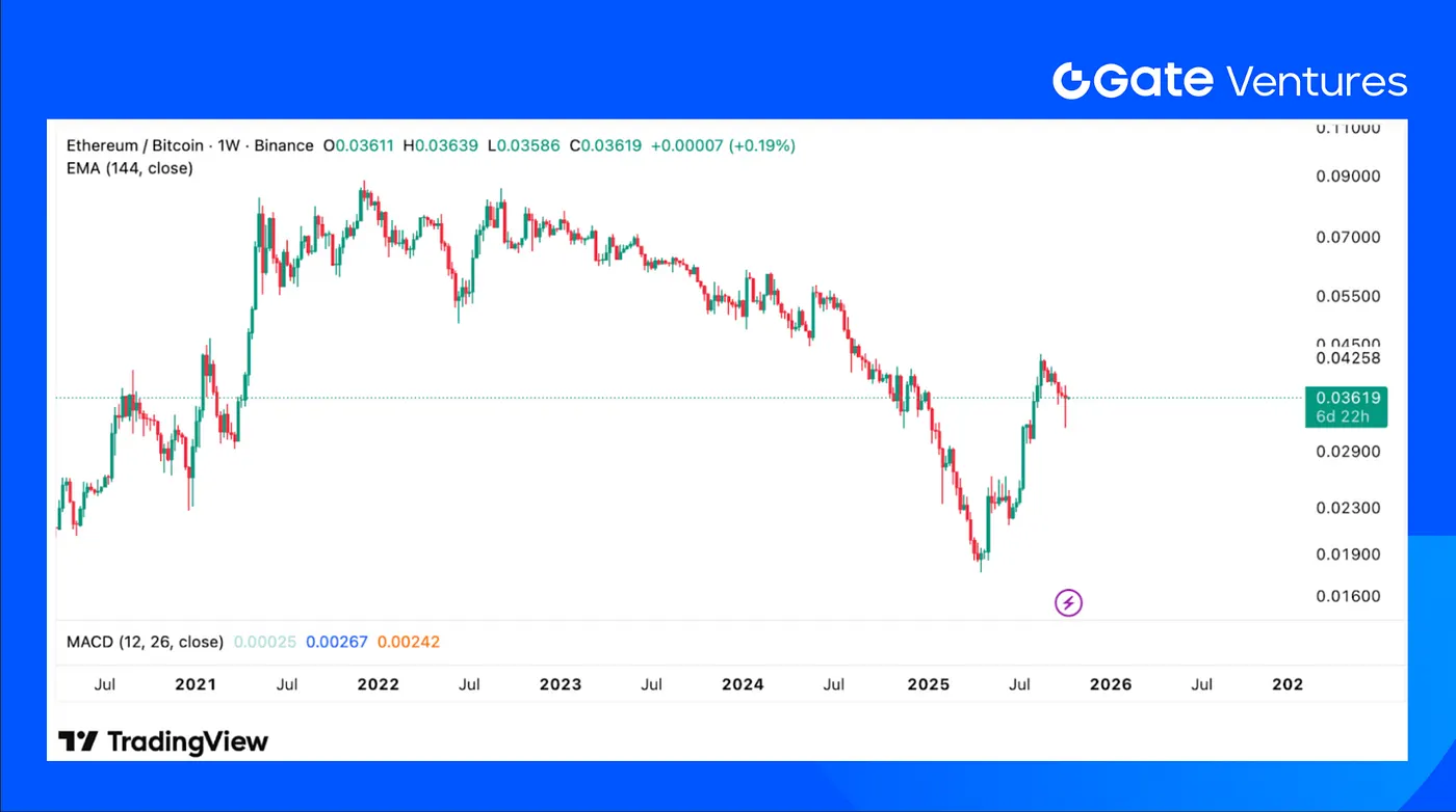 比特币恐惧与贪婪指数因剧烈回调而骤降至38(恐惧)。与此同时,ETH/BTC比率下滑1.2%至0.036,短暂触及0.032,反映出与ETH相关的杠杆头寸的更深层次清算。(7)