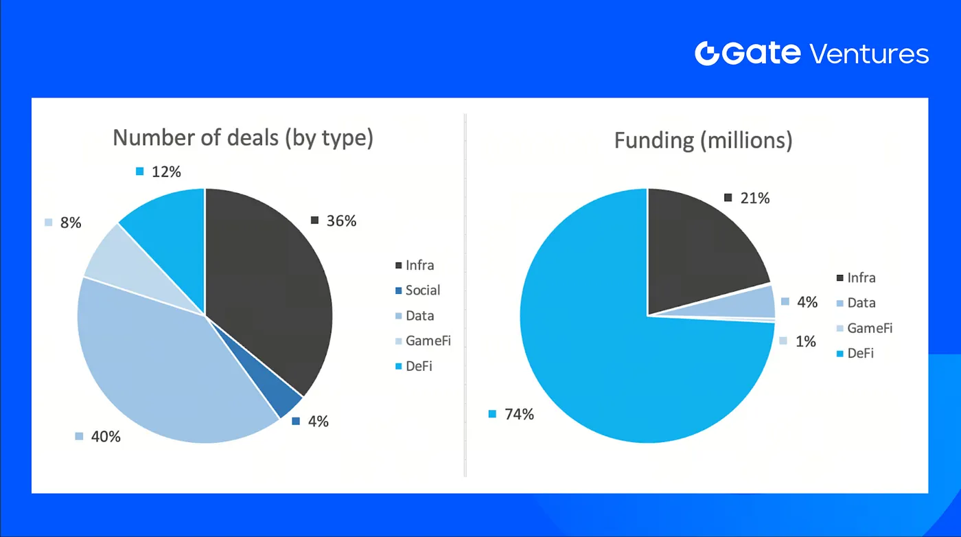 上周成交的交易数量为25笔,其中数据领域有10笔交易,占总交易数量的38%。与此同时,基础设施有9笔(36%),社交领域有1笔(4%),游戏金融有2笔(8%),去中心化金融有3笔(12%)交易。