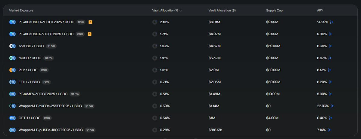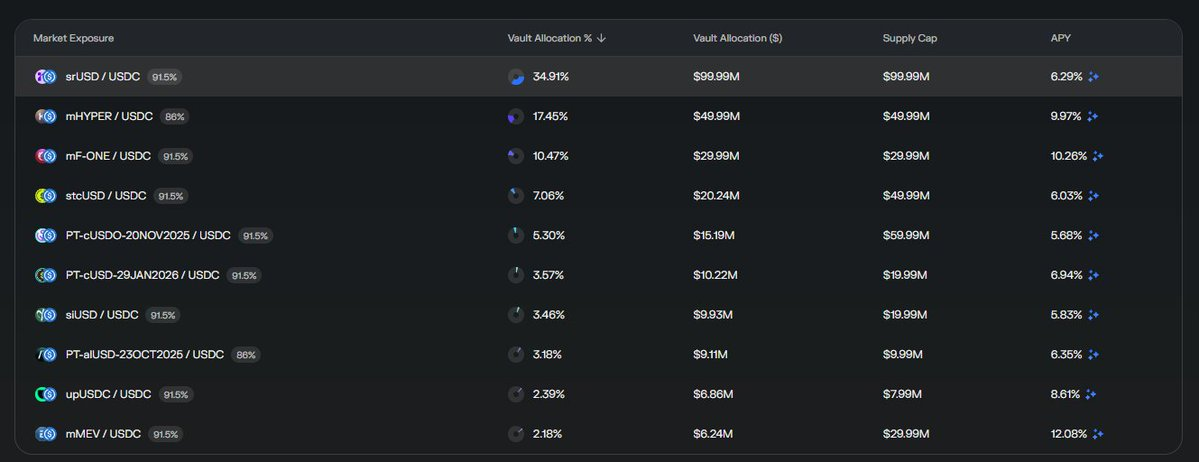 morpho 的金库策展人会选取这些代币,构建多元化的市场中性链下基金组合。策展人实际上就是“基金中的基金管理者”,负责挑选策略、分配权重、平衡投资风险。用户和投资者可以通过金库对这些多元化的市场中性投资组合进行循环加杠杆操作——抵押、借贷、再抵押、再借贷,反复叠加杠杆,把机构级市场中性策略最大化利用。