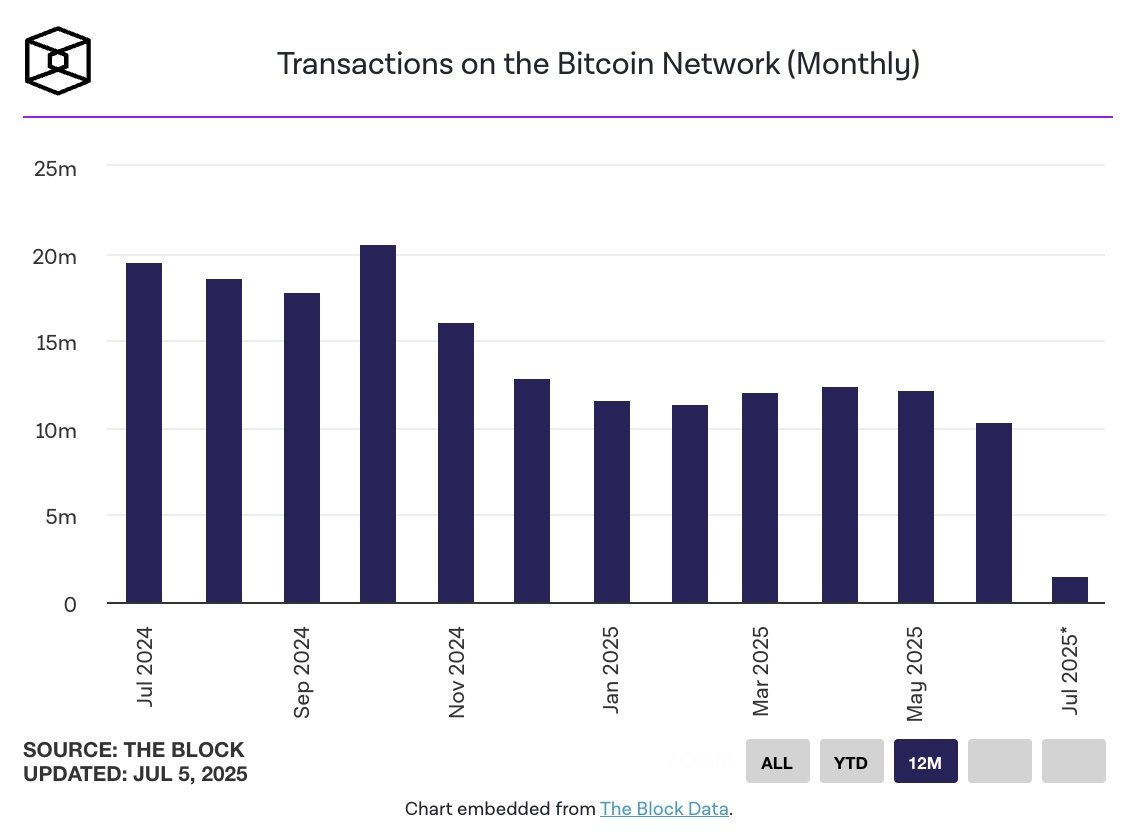 随着低波动性,比特币网络的月交易量在6月份比5月份下降了15%,达到了自2023年10月以来的最低水平。最近几周的交易活动也跌至底部,一些手续费极低的交易仍然被矿工从mempool中选择加入区块。
