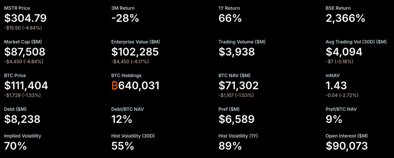 公司的股票下跌了4.84%,降至304.79美元,背景是加密货币市场疲软,对应市值为875.08亿美元。目前,Strategy是美国第121大上市公司,持有640,031 BTC,价值约713.02亿美元。