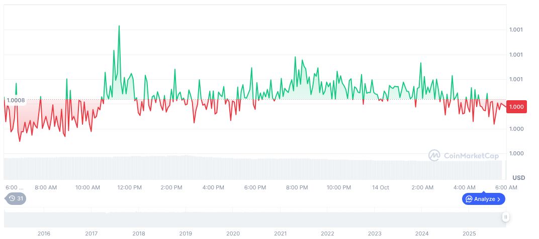 根据CoinMarketCap,Tether (USDT)的价值保持在1.00美元,市值为1799.4亿,市场份额为4.75%。24小时交易量下降了9.47%,为2029.5亿。最近USDT价格变化在24小时内登记为3.91%,在30天内增加了7.43%。