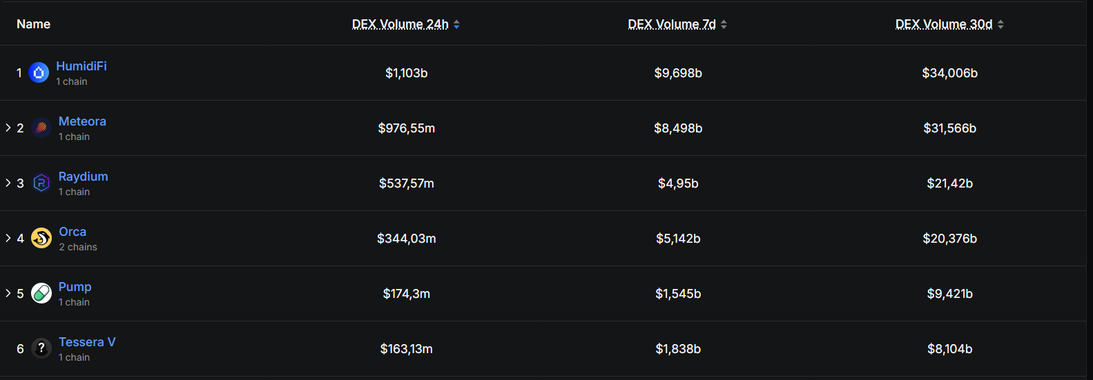 根据DeFiLlama的最新数据,HumidiFi——一个在Solana区块链上的“暗池”协议——已成为该网络最大的去中心化交易所(DEX)。在过去的24小时内,该交易所记录了令人印象深刻的交易量为11亿美元,7天交易量达到96.98亿美元,30天总交易量高达340亿美元,超过了Meteora、Raydium和Pump等竞争对手。