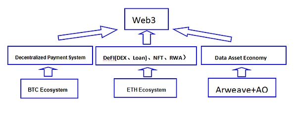 现在 BTC 解决了电子现金确权及交易的问题,使得我们每个人能够掌控电子现金,以太坊通过智能合约和区块链解决了各种金融资产的确权及交易问题;而 Arweave 永久存储 + ao 超并行计算机有望帮助解决数据资产的确权及交易问题,当然本文重点是从数据资产共识这个角度去阐述的,因为这是数据资产确权和交易的关键。个人认为 Arweave 永久存储 + ao 超并行计算机有望与 BTC、以太坊并驾齐驱,形成良好的互补,共同解决 Web3 的关键性问题,进而帮助我们迈进价值互联网。如图所示: