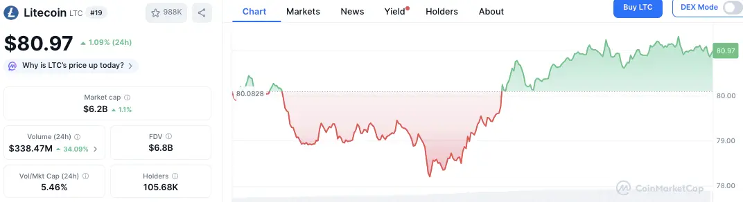 尽管链上活动增加,莱特币的市场价格保持稳定。截至发稿时,莱特币的交易价格为80美元,过去24小时内变化为1.09%。交易量为338.4万美元,增长了34.09%。