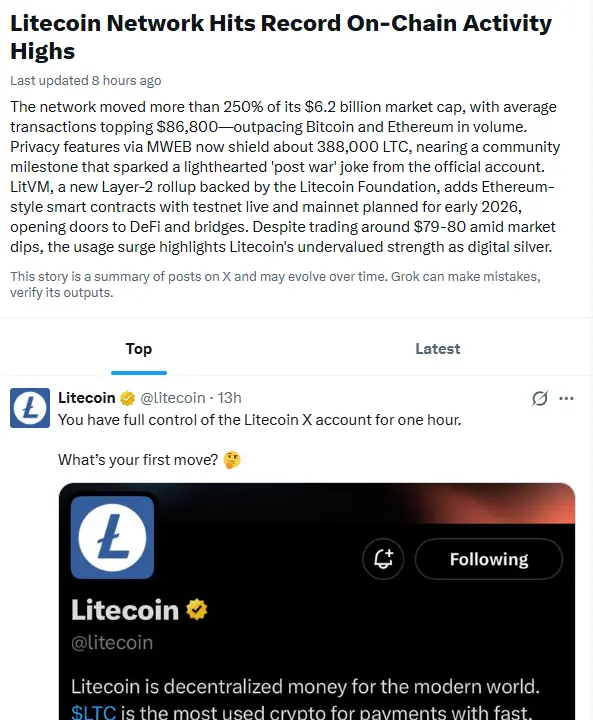 网络使用量的增长与持续的技术开发同步进行。由莱特币基金会支持的LitVM项目,是一个Layer 2的rollup,旨在引入与以太坊兼容的智能合约到莱特币网络。根据项目详情,LitVM的测试网目前已上线,计划在2026年初推出主网。该系统旨在支持去中心化应用和跨链功能,同时不改变莱特币的基础层。